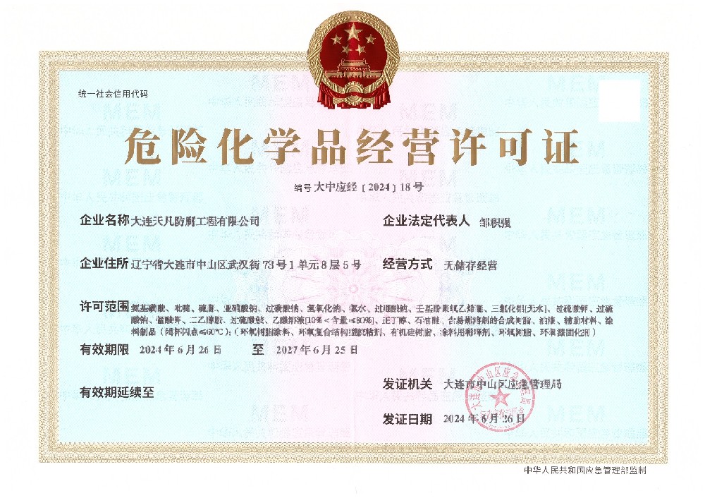 • (大連天凡防腐工程)危險化學品經營許可證書